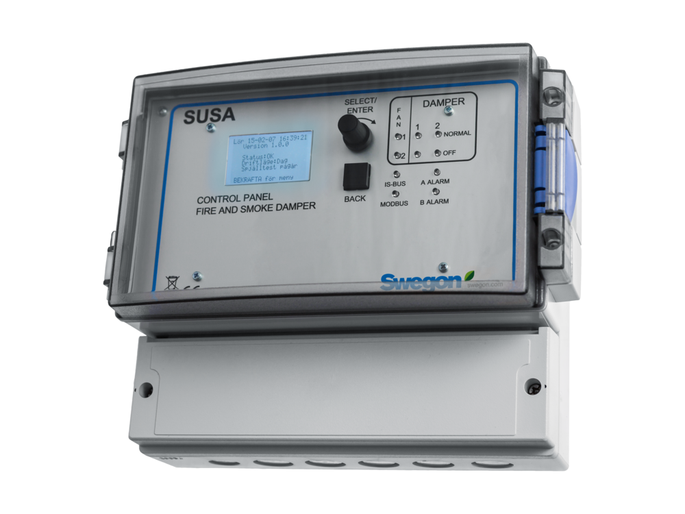 - Ansluts till SUSA (max 3st) och synliggör spjäll & detektorfel (A/B larm) genom lysdiod samt akustisktlarm. Larmet genereras från SUSA ihop med alla eventuella anslutna slavenheter.